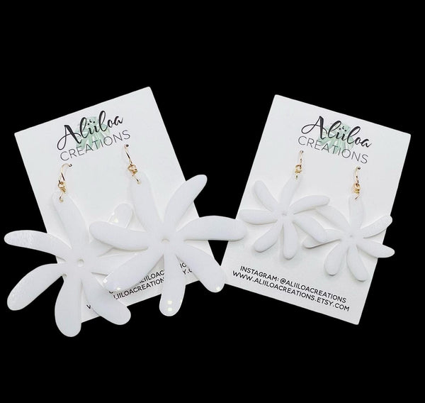 Available in 14K Gold-Filled or Sterling Silver!White Tiare Flower shaped acrylic